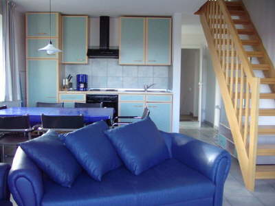 Das Wohnzimmer mit offener Küche, Esstisch, Treppe in Schlafetage, Sitzecke und Balkon / Terasse.